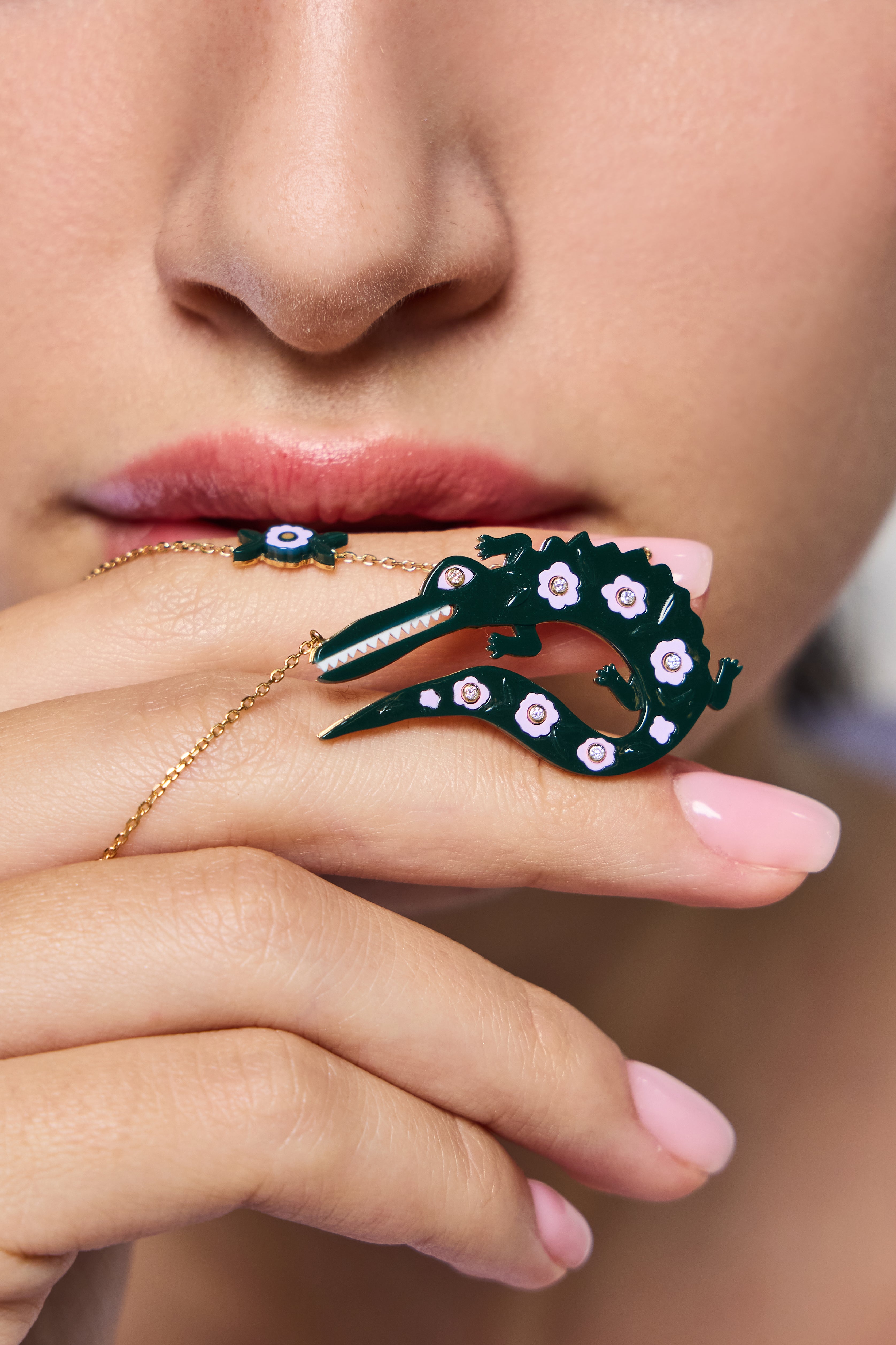 Hand-painted enamel in dark green and light lilac